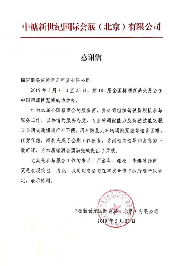 近日,成都車如云網(wǎng)絡(luò)科技有限公司戰(zhàn)略合作伙伴——成都市錦宏商務(wù)旅游汽車租賃有限公司(簡稱:錦宏租車)成功中標(biāo),成為成都電視發(fā)展有限公司汽車租賃指定單位。除此之外,在今年的3月份至5月份期間,錦宏租車還成為了成都市第二人民醫(yī)院公務(wù)車輛定點(diǎn)租賃服務(wù)項(xiàng)目、“四川大學(xué)”公務(wù)用車租賃單位、以及眉山市政府市級(jí)單位租車服務(wù)商。在“2019年第100屆糖酒會(huì)”上,錦宏中標(biāo)成為了糖酒會(huì)指定用車單位,并獲得了中糖新世紀(jì)國際會(huì)展的高度認(rèn)可,并發(fā)來了感謝信。