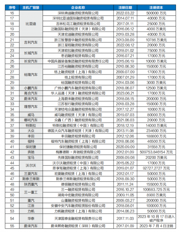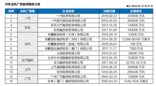 2023年有兩家主機(jī)廠系融資租賃公司進(jìn)行了名稱變更,分別是東風(fēng)標(biāo)致雪鐵龍融資租賃有限公司更名為斯泰蘭蒂斯融資租賃有限公司、裕融租賃有限公司更名為江蘇裕融融資租賃有限公司。